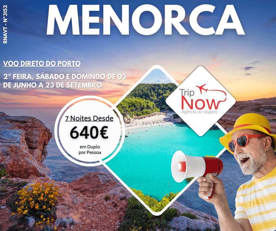 Menorca 24 de Janeiro, 2023 Venha conhecer as águas cristalinas das praias de Menorca! Preço desde por pessoa inclui: Avião direto ida e volta, estadia no hotel em categoria e Ler Mais »