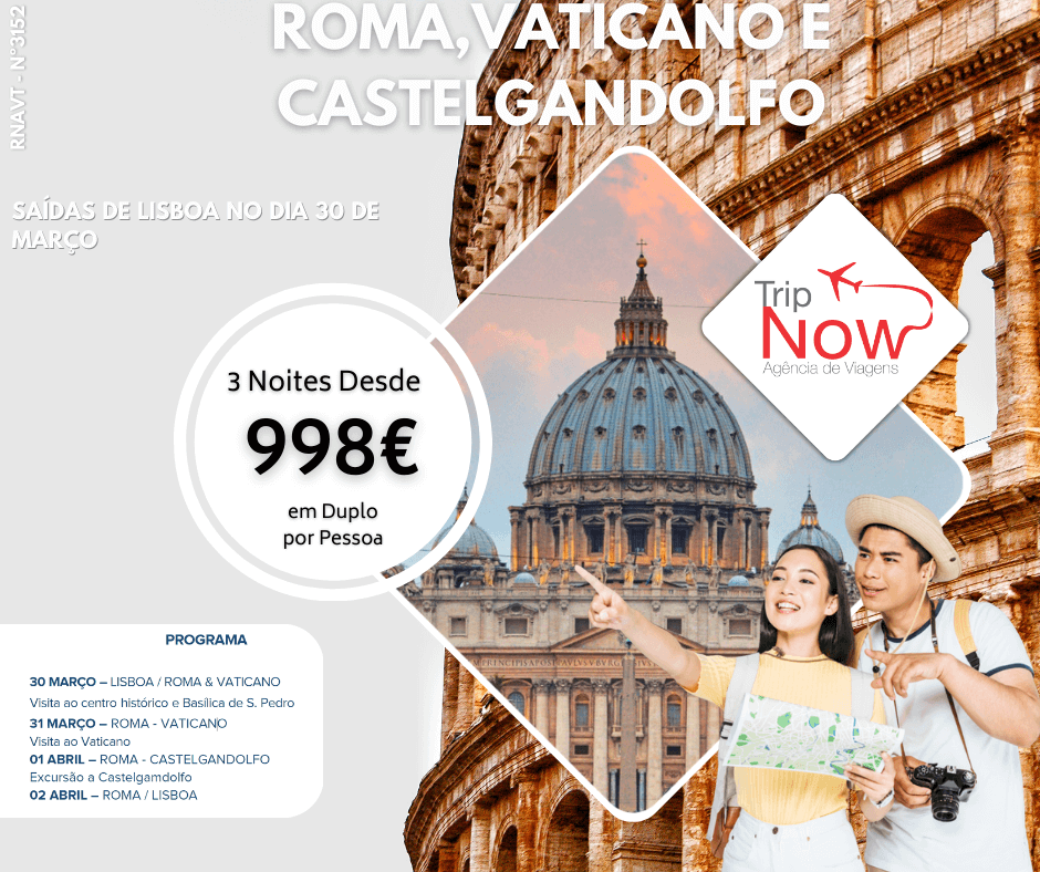 Roma, Vaticano e Castelgandolfo 1 de Fevereiro, 2023 Passagem aérea Lisboa/Roma/Lisboa em classe económica com a TAP (23Kg de bagagem incluída); Acompanhamento por um guia profissional em português, nos transfers de chegada e Ler Mais »
